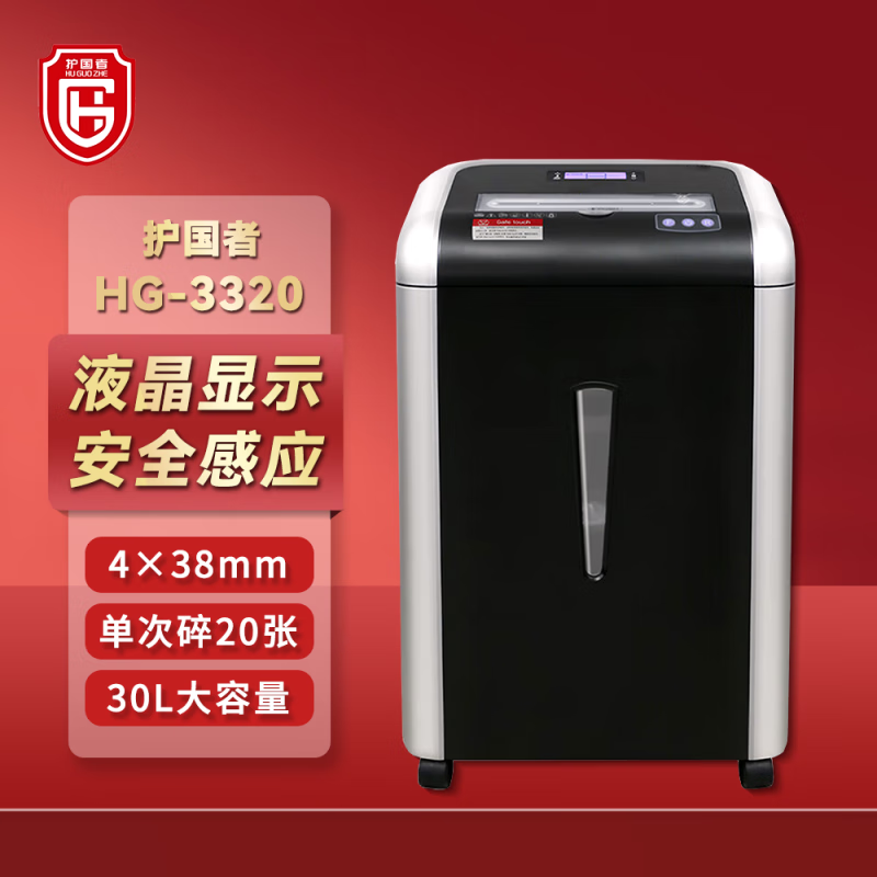 护国者 HG-3320 碎纸机 4 级保密 碎纸能力 20 张 连续碎纸时间 60 分钟 纸箱容量 30L 护国者 HG-3320 碎纸机 4 级保密 碎纸能力 20 张 连续碎纸时间 60 分钟 纸箱容量 30L